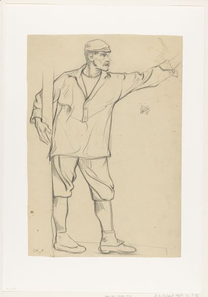 Editor: This is "Standing Man with Stick in His Hands," a drawing by Leo Gestel, sometime between 1891 and 1941. It’s a really simple graphite sketch, but something about the figure's hunched posture gives it a very intense mood. What do you see in this piece? Curator: Indeed, it's simple, but brimming with evocative power. Notice how the stick, an almost archaic symbol of authority, intersects the body's line. It's as if the figure is both supported and constrained by tradition, burdened perhaps. Does that resonance chime with you? Editor: Yes, the way he clutches it so tightly seems to suggest a dependence, like it's part of his very being. The posture could imply struggle? Curator: Precisely. Consider that the timeframe puts this within the birth of Expressionism. The raw emotionality isn't just the artist's sentiment but a collective societal unease finding form. The rough lines, they convey more than mere representation, right? What stories do they whisper to you? Editor: I see a folk character, perhaps caught between worlds, old beliefs fading, and a future unknown. Curator: Good. Each line, a conduit to cultural memory, each shading revealing a psychological weight. This seemingly simple sketch transforms into a poignant reflection on the human condition. Don’t you find that extraordinary? Editor: Definitely! I went in expecting a basic figure drawing, but I am coming away seeing the power of simplicity to communicate really complex feelings and anxieties. Curator: It’s how imagery can carry emotional and cultural burdens. Keep seeking these echoes, they're the key to unlocking the artwork’s deeper story and understanding what persists in the present.