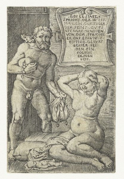 Editor: This is "Gehoor (Auditus)," an engraving by Georg Pencz, made sometime between 1542 and 1546. The figure seems almost melancholic. It’s fascinating to see how the textures are created through engraving. What can you tell me about its historical context? Curator: It's crucial to understand the social function of prints in the 16th century. Engravings like these were widely disseminated, effectively democratizing imagery. This image, part of a series on the five senses, exemplifies the Italian Renaissance influence on Northern art. Considering the "Auditus" title and the presence of musical instruments, the portrayal of "hearing" extends beyond the literal, hinting at intellectual reception and refinement, attributes associated with the upper classes. Editor: So, the allegory connects hearing to social status through access to music and learning? Curator: Precisely. The inclusion of the pig is interesting; it serves as a contrasting element. Do you see how the inscription "TRVX A PERAVDITV" speaks to a potential moral lesson? Editor: Possibly something about not being 'deaf' to higher virtues, as indicated by the classical instruments versus the base animal instinct? Curator: That's an insightful interpretation! These prints circulated amongst various social classes, meaning their meaning may be reinterpreted in different settings. Can we be sure if this was seen as elitist? Or perhaps it inspired aspirational values. Editor: That's a good point. It makes you wonder about the artist's intent and how much control they had over the print’s interpretation once it left their hands. Curator: Exactly! And that is where the fascinating political play of art and imagery comes in. Prints offered artists a powerful way to engage with, and shape, the public imagination. Editor: It's interesting how much a small engraving can reveal about society's values. Curator: Indeed!