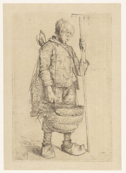 Curator: Here we have Pieter Christoffel Wonder's drawing, titled "Boer met pijp in de mond en emmer in de hand", which roughly translates to "Farmer with pipe in mouth and bucket in hand," created sometime between 1790 and 1852. It's a pencil drawing showcasing the artist's romanticism. Editor: He looks tired. Not dramatically, but in the way of someone whose body is just constantly reminding them it exists. All conveyed through simple lines and shading, which is rather impressive, no? Curator: Indeed. Consider how this artwork can be contextualized within broader discussions of labor and representation during this period. Wonder’s focus on the farmer, pipe in mouth, invites us to contemplate not just individual experience but also prevailing attitudes towards laboring classes. How are rural communities framed, and to what end? Editor: Right, right… framed. Like an exhibit A for some social theory class! But seriously, it is powerful how he captured that sense of… weary dignity. It makes me wonder about the relationship between the artist and his subject, no? Curator: Exactly. Wonder, though recognized in his time, often grappled with social positioning in relation to his subjects. This connects with the romanticized visions that emerged within broader sociopolitical power dynamics. How much of a distance existed between artist and subject at the time? Is that visible, or does it collapse due to a will to elevate this worker through art? Editor: Or is it Wonder projecting his own "wondering" onto this farmer's image? Perhaps he is yearning for a simpler life, a different way of being… maybe through the haze of pipe smoke. Curator: Which brings us back to that key theme of Romanticism…a sentimental vision often obscuring complexities of actual living and material conditions. What stories are privileged, and who gets to tell them? Editor: It is beautiful to think that even within this 'romanticised' take, a true connection – or at least, a sincere effort to connect – still breathes life into this seemingly simple drawing. It's quiet, unassuming, but deeply resonant. Curator: Agreed. It prompts us to critically reflect upon social narratives and their aesthetic manifestations. Editor: In the end, it's more than just a farmer with a pipe; it's us seeing ourselves.