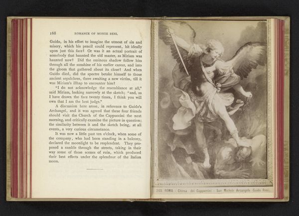 Curator: Here, nestled within the pages of an old book, is a photogravure reproducing a painting entitled "Archangel Michael Trampling Satan." Created sometime between 1852 and 1862, the artwork comes to us courtesy of the Rijksmuseum, its maker presently unknown. Editor: Whoa, there's so much happening here—a chaotic struggle, like something unearthed from a baroque dream. I'm immediately drawn to Michael’s wings. They appear so...heavy, like he's an angel weighted down by duty, more warrior than a celestial being. Curator: Absolutely. It's worth noting the powerful symbolism, too. Michael, the epitome of divine righteousness, stands triumphant over the serpentine Satan. He wields his weapon—likely a sword or spear—ready to strike a final blow. The message of good conquering evil is pretty direct. Editor: Oh, certainly direct. I'm more intrigued by how the serpent morphs, how the lines suggesting it bleed into what is also quite explicitly a tormented man. It's all about control, not only religious control, but a repression of animal nature within. Almost a cautionary Freudian tale, really, and it does strike me as a bit sinister that this is featured inside a novel; it's a picture about what kind of stories we need to repeat to ourselves to control unruly human impulses. Curator: That’s interesting! It is certainly open to broader interpretation. From a traditional standpoint, Archangel Michael is a very common and revered figure across multiple cultures. He represents not only triumph but also protection and justice. It is curious, given that context, that this particular portrayal feels unsettling, a feeling definitely heightened by the book context. Editor: Yes, exactly. Considering the piece’s date, in the mid-19th century, the piece sits between traditional religious imagery and new theories of psychology and the unconscious. Perhaps this moment represents an awareness that evil may not be easily banished, but kept at bay at great cost, by very human guardians with weighty wings? Curator: Food for thought indeed! So much from one small page. Editor: A small page for such a large theme, yes. Always a potent combo!