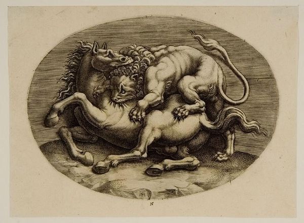 Curator: This engraving, titled "Horse Attacked by a Lion," is by Adamo Scultore. What strikes you immediately about this depiction? Editor: Its raw ferocity—the lion's claws, the horse's desperate struggle. You can almost feel the tension of muscle and bone. What's the medium? Curator: It’s an engraving, a printmaking technique where the image is incised into a metal plate. The physicality of this labor, transferring that energy into the artwork, is palpable. Editor: Absolutely, that's fascinating. I'm also thinking about the political symbolism – this power dynamic. The "lion" representing perhaps oppressive forces, and the "horse" as a symbol of the people? Curator: That's a valid reading, but perhaps it also reflects broader power structures and anxieties prevalent in the society that birthed this work, considering themes of domination and resistance. Editor: A potent reminder of the artistic decisions and their impact on how we perceive the interaction of strength and vulnerability. Curator: Indeed, and a visceral demonstration of the creative labor that brings such complex narratives to life.