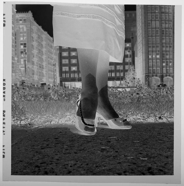 Editor: This is Jack Gould's "Untitled (woman's lower legs and feet)." It's a small, intriguing photograph. The negative image creates a ghostly feel. What's your take on this unexpected view? Curator: It whispers of fragments, doesn't it? A narrative deliberately left untold. I'm drawn to the anonymity, the cropped perspective, almost like a dream half-remembered. It leaves room for our stories to fill the gaps. Editor: I like that. I hadn't considered the storytelling aspect. Curator: Indeed, it's not just what is there, but what isn't. The missing face, the implied narrative. Sometimes, the most profound art lies in the omissions. Editor: So true! It definitely makes you think.