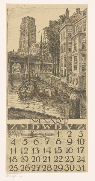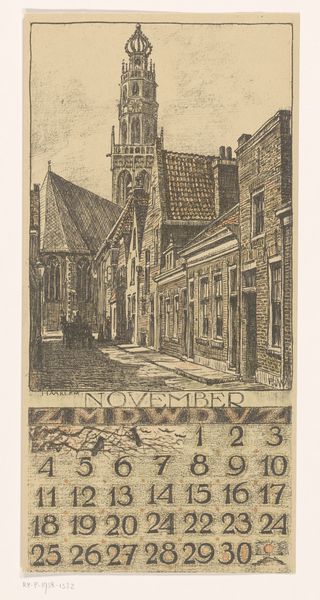 This calendar for October, by Ferdinand van Wolde, probably dates from around 1938, judging by the date at the bottom of the print. Executed with fine lines, it has a muted palette of creams, browns, and greys, creating a harmonious and picturesque scene. The print employs a strong central perspective that pulls the viewer into the urban landscape, with the tower anchoring the composition. The cobbled street is framed by buildings on either side, rendered with detailed cross-hatching. As we examine its structure, the calendar does more than mark time; it encapsulates a specific sense of place through its architectural accuracy. The depiction of Amsterdam merges functional design with artistic expression. The print serves as both a practical object and a symbolic representation of the city. The linear structure of the calendar contrasts with the organic depiction of the buildings. Each element reinforces the other to create a unique viewing experience.