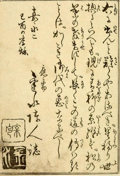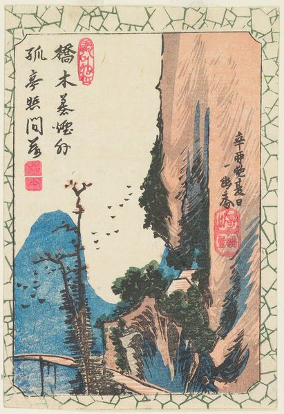 Editor: This is an original print by Matsubara Naoko from her Kyoto Woodcuts publication. The black ink against the off-white paper creates a striking contrast. What symbols or deeper meanings do you see here? Curator: The script certainly draws the eye. Notice how the characters are integrated with the landscape, almost becoming part of it. How does that integration speak to the relationship between humans and nature within Japanese culture? Editor: That's a fascinating point. It seems to blur the lines, suggesting they're interconnected. Curator: Precisely. The symbols and imagery in art, across time and cultures, reflect shared emotional and cultural memories, and a continuing story. Editor: I’ll definitely look at art differently from now on. Curator: Me too!