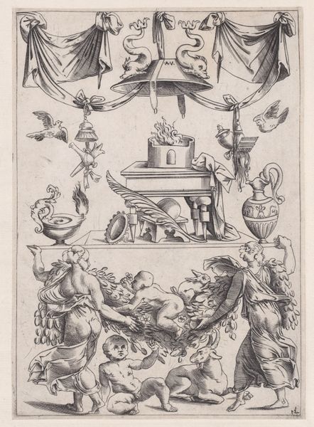 Curator: What strikes you about this engraving, "The House Built Upon a Rock," created between 1598 and 1604 by Hendrick Goltzius? Editor: It’s fascinating! I am drawn to its incredible detail. The composition feels very busy with all the figures and text, almost overwhelming, yet meticulously crafted. It feels crowded, like an allegory packed into a tight space. How do you interpret it? Curator: Consider the printmaking process of the era. Engraving involved significant manual labor; each line painstakingly carved into a metal plate. Think of the artist's hand, meticulously reproducing imagery, ideas, and religious teachings for wider consumption. Notice the juxtaposition of earthly figures and divine pronouncements. What do you make of that? Editor: The detail in the clothing and faces contrasts with the heavy stone architecture, almost as if emphasizing both earthly toil and spiritual strength... So, you’re suggesting the material process of its making – the physical labor – reinforces the spiritual message? Curator: Precisely. This piece blurs lines, much like how art production then often challenged traditional high/low art distinctions. Even its purpose: Was it high art? Propaganda? A demonstration of skill meant to impress wealthy patrons who controlled art production? Think about the act of dissemination too – these prints traveled, carrying Goltzius’ message (and artistic prowess) far beyond his studio. Where was this piece located again? Editor: It’s currently held at the Rijksmuseum. So the act of display now is another layer adding to its cultural context. Curator: Exactly! How this object, crafted through immense labor and material skill, moves through time, constantly renegotiating its meaning within differing socio-economic landscapes, from creation and distribution in the early 17th century to its enshrinement in a modern museum. What resonates with you now that perhaps didn’t initially? Editor: I see it now: not just a crowded scene but a document of production and faith, intricately linked! It brings a whole new meaning to its title, a true marriage between matter and meaning!
