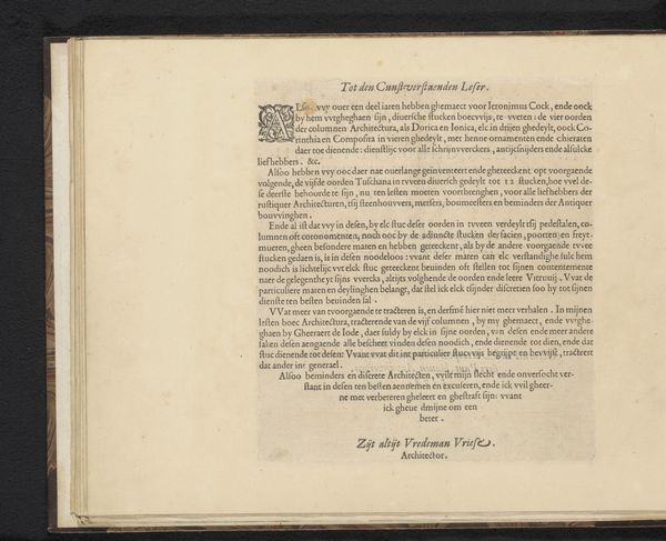 Curator: This image shows a page from a book, "Aan de lezer," possibly from 1616 or 1617, created by David Roelands. The book's medium includes paper and typography. What are your initial thoughts on it? Editor: It looks very academic, dense even. All that tightly packed text! It feels like a serious proclamation. I wonder, what cultural stories or meanings are embedded within this old book? Curator: The act of printing itself carries enormous symbolic weight. Consider the implications: democratization of knowledge, challenging authority. This page represents not just words, but the dawn of a new way of thinking and sharing ideas. Do you see how the words are laid out in relation to each other? Editor: You mean the blocks of text? It feels very ordered, logical. Curator: Indeed! Think of typography as a form of visual architecture. Each letter, word, and line contributes to the overall structure and the meaning conveyed. The evenness, the careful alignment... it suggests a desire for clarity and control in disseminating information. And who would have been reading this? Editor: Educated people, I guess. Scholars, maybe? Was reading more of a public event back then, something done aloud? Curator: Precisely! Reading wasn't always a solitary activity. Texts were often shared and interpreted communally. So, what do you think about the long and elaborate sentences on the page? Editor: I would have stumbled over them. I guess reading aloud allowed for a different type of understanding. It's fascinating to consider how different the reading experience would have been. This work reminds me that books are not just containers for information; they’re artifacts steeped in cultural practice. Curator: Exactly! Now consider the choice of language. Was it the common tongue, or reserved for a certain elite? The selection, display, and intent tell of cultural memory we might be quick to overlook.