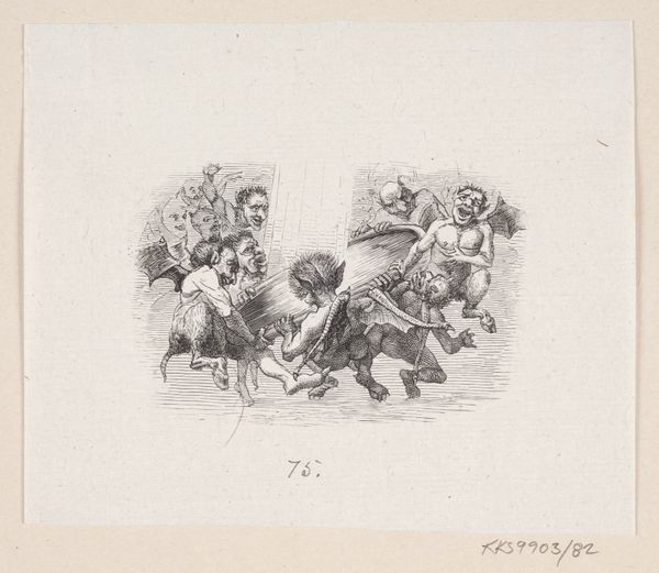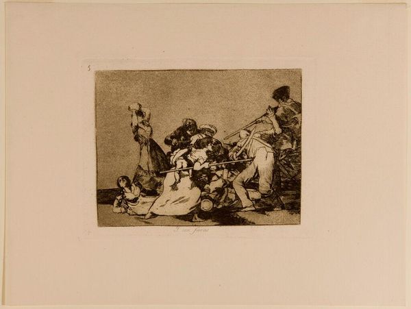 Curator: Goya's "What More Can One Do?" leaves you breathless, doesn't it? It's a stark etching, a whisper of horror in sepia tones. Editor: It's more than whispers, I think. It's a condemnation of violence, situated in the context of the Peninsular War. Look at how the victim is positioned, almost Christ-like, against the faceless perpetrators. Curator: Faceless, yes, though that soldier on the right does seem to have paused, doesn't he? There's a flicker of something… human? Editor: I see his posture more as indicative of the banality of evil. Bureaucratic even. Violence as a chore, another day at the office. It’s a portrait of dehumanization, where the body becomes a site of political struggle. Curator: Perhaps you're right. The title itself, "What More Can One Do?" hangs like a taunt, doesn’t it? Implying infinite cruelty. Editor: Exactly. It's about the limits of resistance, the unbearable weight of oppression, but also a challenge to us: what will we do? Curator: A reminder that even the smallest act of witness can be a form of defiance. Editor: Indeed, art as a form of resistance, bearing witness to atrocities, and demanding justice. It’s a dark mirror, but a necessary one.
