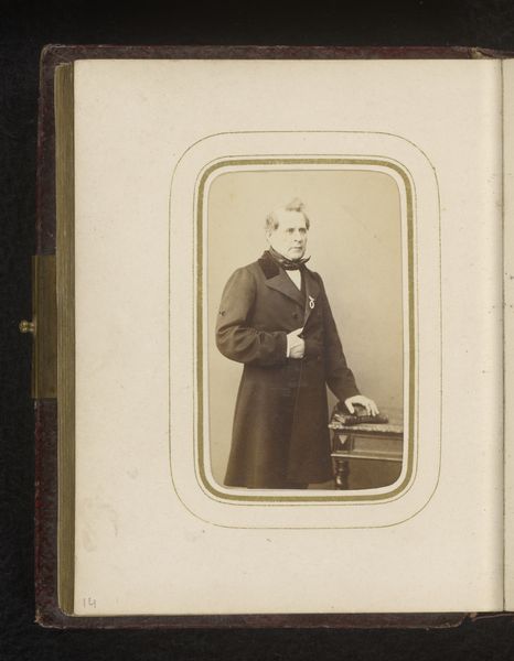 Curator: This is Isidore Démée’s "Portrait of a Man, Standing by a Pedestal," a gelatin silver print made sometime between 1860 and 1900. Editor: There's such an intentional rigidity in the man's posture; the composition really amplifies that. He seems trapped within the formality of the pose, almost staged against the backdrop. Curator: Consider the industrial and chemical processes involved in creating a photograph like this. Gelatin silver prints emerged as a refined technique that shifted photography from the realm of purely artistic to one readily available for mass consumption and documentation. Editor: That makes me think about accessibility, and who this portrait was for. Was this image intended for public consumption, or a private memento for family, asserting social status during an era defined by rigid class structures? This period also saw photography used to create eugenic types… I hope that is not the case. Curator: These photographs depended on very specific labor. It makes one wonder who worked in Démée's studio to produce such an image, and whether their social class intersects with, and is ultimately different from, that of the photograph’s subject. Editor: Absolutely. Thinking about those untold stories, about class and access...it reframes how we read this seemingly straightforward image. And that very somber palette reinforces how race was visualized through portraiture at the time. Curator: Yes, analyzing photographs as artifacts embedded in economic systems gives us tangible evidence of the complex social relations of the era. It also brings to light forgotten stories embedded within what initially may appear simple and straightforward. Editor: Examining Démée’s photograph through these different lenses really pulls the nineteenth century into sharp, and complex focus, making one reflect on today’s social environment.