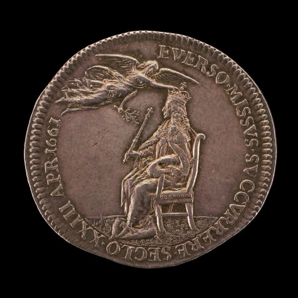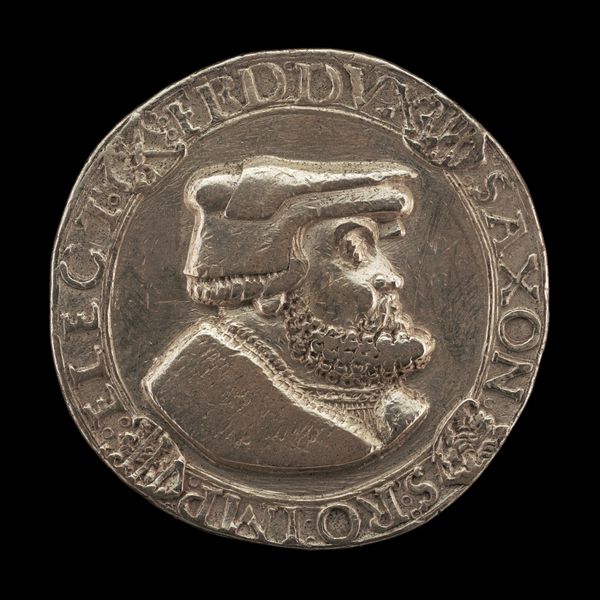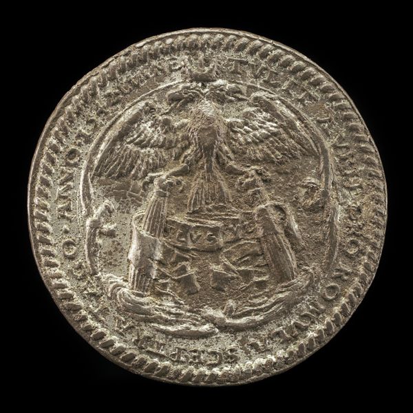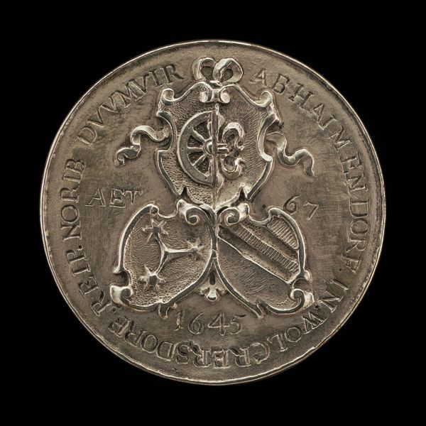 This unpainted metal roundel without a date was created by Matthes Gebel. The composition of the piece is dominated by a central heraldic design, featuring a shield, crest, and mantling. The circular form and the raised relief create a tactile quality, inviting a close examination of the intricate details. The lines are deliberate, defining the heraldic elements, while the texture of the metal provides a subtle, almost aged feel to the piece. Heraldry as a system operates on a semiotic level, where each symbol – the shield, the crest, the mantling – signifies specific meanings related to lineage, status, and identity. The artwork functions as a signifier of power, reflecting the hierarchical structures prevalent during Gebel’s time. The absence of color reduces the visual noise, allowing for a focus on the structural arrangement and the symbolic language employed. This reduction invites a deeper exploration of the codes and conventions embedded within the heraldic system, and how Gebel engages with these established meanings.
