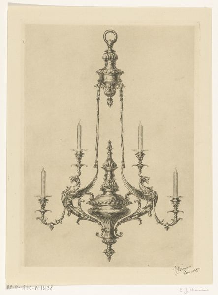 Curator: Here we have Henri Cameré's "Ontwerp voor een kandelaber," a design for a candelabra dating from around 1864 to 1894. The sketch employs pencil and ink to realize this design. Editor: It has an incredible sense of lightness and movement, even though it's just a drawing. I find myself immediately drawn to the figures on either side, seemingly supporting the weight of the candelabra above. There’s a whimsical almost ethereal quality to them. Curator: The choice of pen and ink lend to that effect, the spontaneity captures the spirit of the Art Nouveau movement which favored fluid lines and organic forms. We see decorative art taking hold with emphasis on ornamentation. I believe the candelabra sketch would likely have appealed to an emerging bourgeois consumer class who valued elegant functional objects for the home. Editor: I’m fascinated by the use of classical figures merged with a growing decorative trend. Is this simply aesthetic, or does it represent an effort to legitimize Art Nouveau, aligning new styles with established historical symbols of wealth and power? Curator: That's precisely the question this provokes. Consider the rise of industrialization, with an ever increasing production of consumer goods. We see here a design seemingly consciously referencing past symbols, creating layers of status and sophistication. This aesthetic allowed consumers to indulge in what they imagined was luxury. Editor: I think too about accessibility and social participation. This image signifies what could be owned and obtained based on class structures and expectations. Who were these pieces created for, and more importantly, who did not have access to them? Curator: These questions are crucial. And as an object destined for a domestic space, the candelabra is very much engaged with ideas surrounding private displays of affluence. Editor: And the construction of "good taste," a loaded concept, really. Thinking about the visual language embedded within seemingly innocuous domestic objects is important. Curator: It certainly gives us a glimpse into the complexities of art, society, and the individual's place within it during a period of great change. Editor: It reminds us to remain critical about art's engagement with ideology and consumerism, and how these forces shaped past aesthetics.