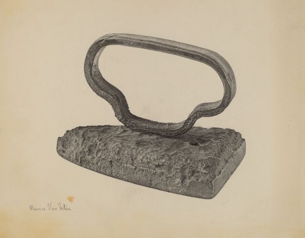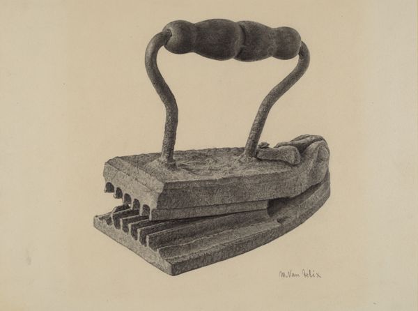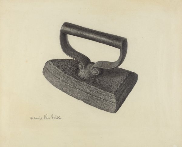 Curator: This pencil drawing, created around 1940 by Maurice Van Felix, is entitled "Flatiron". It presents a detailed study of an old-fashioned clothes iron. Editor: The textures are incredible; there's a real weight to the object in this rendering. A solidity that speaks to the labour it represents. But also… a stark, cold stillness. It's not inviting. Curator: Indeed. One can interpret its stillness in relation to domesticity, but consider how societal expectations of women at that time were themselves being critiqued. Art Deco designs were streamlining forms and functions as the modern women gained momentum, even through world conflict. An academic exercise, sure, but also an object study steeped in transition. Editor: I notice the artist paid close attention to the handle, with its rope or cord wrapping. It evokes both function – protecting hands from heat – and also perhaps a nautical symbol of binding and labour. What do you make of the attention given the eroded base; it seems disproportionate somehow. Curator: I see your point, it contrasts the presumed function, this wear. The formal aesthetic tradition values accurate rendering as a record, and one reads in the record commentary reflecting the contemporary concerns, class anxiety during the lead up to and duration of the war perhaps. The handle, smooth with purposeful form versus the base, a heavy well worn form… Editor: Interesting…I get this sense that Van Felix, deliberately drew a kind of weariness into the mundane object. I’m captivated by what at first seemed a simple drawing of domestic object but I notice how subtly he conveyed meaning to it. Curator: Art invites those dialogues; each artist invites it in unique ways to provide unique interpretations to contemporary audiences. Editor: Well, seeing how much one simple, everyday object contains, makes you rethink everything you see!