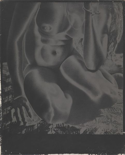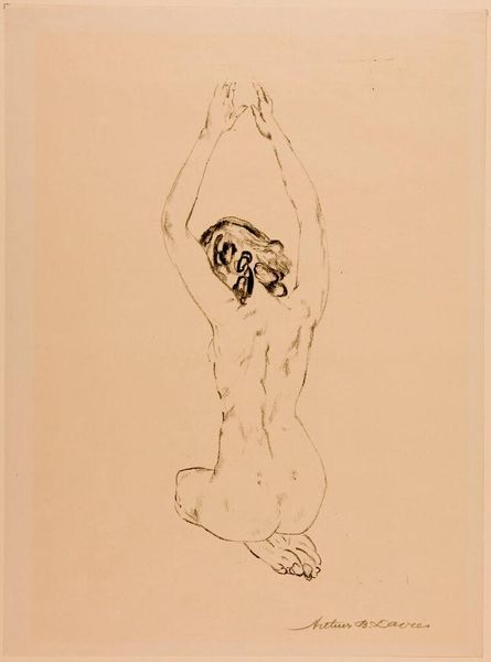 Curator: Here we have "Rear Pose," a 1937 drawing by Kaye Waters, primarily using pencil and charcoal. What catches your eye? Editor: Immediately, there's a sense of melancholy; the averted gaze and the subdued tones create a quiet, contemplative mood. It also has this somewhat odd abstract construction that almost seems modernist. Curator: I'm interested in the deliberate choice of medium here. The blending of pencil and charcoal allowed Waters to achieve a unique level of tonal gradation, particularly in rendering the texture of the skin and the draped fabric. Charcoal, historically affordable and widely available, also hints at a wider production and audience for this type of work in its time. Editor: I'm more struck by how she chose to portray this figure, the pose almost evokes vulnerability but also, in a sense, timelessness. The symbolism of the female nude, particularly from this perspective, can carry layers of meaning, from classical ideals of beauty to more personal, introspective themes. The cascade of hair acts like a kind of symbolic veil. Curator: Certainly, the handling of the drape introduces elements of texture and visual interest, highlighting her mastery of the medium but more fundamentally, the inclusion of fabric speaks to the industrial production involved. How the depicted cloth moves from loom to representation introduces questions of labour. Editor: What is so poignant is how it contrasts the fleeting nature of human existence, and human vulnerability. Its message feels especially charged, considering when it was made. Curator: Ultimately, what intrigues me most is how Waters transforms commonplace, industrial materials into a moment of perceived artistic skill, while at the same time using the symbol of a single model, laboring for their income. Editor: And for me, it’s that haunting feeling. A meditation on vulnerability.