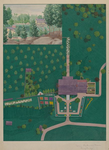 Editor: So this is “Ketteltas Estate,” a mixed-media drawing from around 1936 by Helen Miller. It’s a detailed plan of a formal garden and it feels very controlled, very symmetrical. What do you see in this piece? Curator: I see a deliberate effort to impose order and meaning onto the landscape. The symmetry itself is symbolic; it reflects a desire for balance, for harmony with an underlying ideal. The formal garden, with its precisely shaped beds and carefully placed trees, becomes a microcosm of a perfectly ordered world. Look at the star motif, how it’s both echoed and contained in each of the beds. What does that signify to you? Editor: Well, the star makes me think of maybe guidance or aspiration, but contained, it does feel a bit stifled maybe? Curator: Precisely. The artist uses symbols that reach back through centuries – the star, the ordered garden – yet frames them within the anxieties of her own time, the pre-war years where control and planning offered some solace against a looming chaos. Consider the very specific choices Miller makes. The East River bordering it all – the natural versus imposed, the known and unknown. Editor: I never would have picked up on that tension just from looking at it. So, you're saying it’s not just a garden plan, it's a commentary? Curator: It is precisely that. A mirror reflecting cultural anxieties and a testament to the human need to find meaning and control, however illusory, through symbolic landscapes. And how that memory persists through generations in this very rigid layout. Editor: Wow. I’ll definitely look at landscape art differently now. Thanks! Curator: My pleasure. There is so much that one sees by looking back in order to look forward.