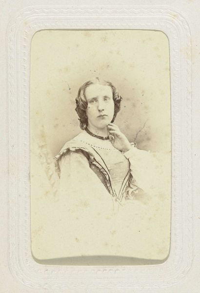 Curator: This gelatin-silver print from between 1863 and 1884 presents us with a portrait of Amalia van Saksen-Weimar-Eisenach, crafted by Nicolaas Johannes Wilhelmus de Roode. Editor: It's striking. The oval format combined with the hazy gray tones evokes a kind of wistful remembrance. Curator: Indeed. De Roode was working during a fascinating transitional period in photography. We see advancements in photographic printing allowing for multiple copies and a wider distribution of portraiture amongst the rising middle classes. Editor: Looking at the details in the lace of her shawl, it appears remarkably precise for an early photographic print, doesn't it? How did he achieve that level of detail? Curator: It likely involved meticulous darkroom work. Gelatin-silver prints allowed for sharper images than earlier processes, but mastering the technique to capture such nuance required significant skill. Think about the labor involved – preparing the chemicals, coating the paper, precisely controlling exposure and development. It was a highly skilled, artisanal practice, very much in line with printmaking. Editor: It’s interesting to consider this within the larger context of portraiture at the time. Photography, while gaining traction, was still vying for status against painted portraits, right? These photographic prints democratized portraiture in some ways, making them more accessible but they also changed the relationship with images. Curator: Precisely! The relative affordability of these images altered notions of status and representation, impacting social structures. Editor: It does make you wonder about Amalia herself, and how this image shaped her public persona within that context. Curator: Exactly, her family ties with the Dutch royalty granted her the economic mobility and allowed her image to be consumed by a wider public and construct that persona you mentioned. Editor: I hadn't thought about this work within that social framework initially; I was more caught up in its nostalgic feel, but now I see so many factors involved in producing it, even in its distribution channels. Curator: It’s rewarding to consider not just the visual impact, but also the production, the skill, and the socioeconomic contexts at play in photography from this time.