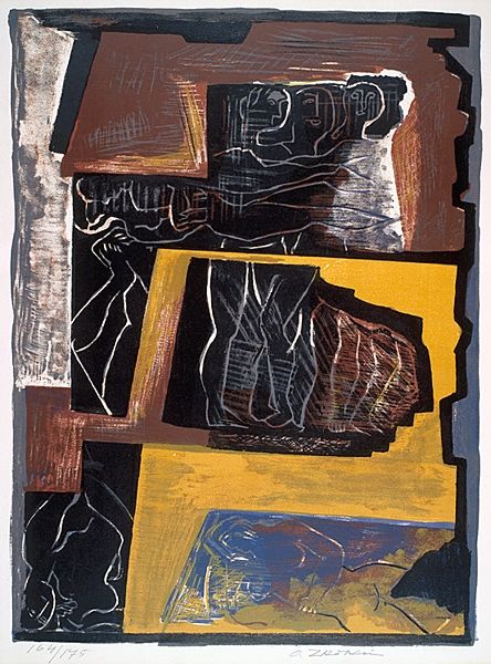 David Michael Hinnebusch made this piece, "Nipple Ring," with what looks like mixed media on paper, and he's not afraid of a little mess. The colors here are bold and juicy: reds, oranges, blues, all colliding like thoughts in your head when you're trying to make sense of something. There’s a real push and pull between abstraction and figuration. You can almost make out a body, maybe, or is it just a feeling of a body? Look how the reds bleed into the blues, creating these hazy edges. It’s like Hinnebusch is inviting us into his process, showing us the messy, beautiful struggle of trying to capture something real. That little white ring on the left, the nipple ring itself, feels almost like an afterthought, a tiny detail in a much larger emotional landscape. It's like Guston’s late work, all raw feeling and unapologetic honesty. Art isn’t about answers, it's about the questions.