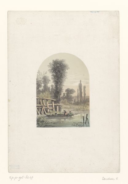 Editor: This lithograph, “Tropisch landschap,” by Carel Christiaan Antony Last, dates back to 1856. The muted colors give it a slightly faded, almost dreamlike quality, despite the clear depiction of a tropical scene. The juxtaposition of the lush landscape with the inscription gives the impression of a bookplate or frontispiece. How do you interpret this work, especially considering its historical context? Curator: I see this image deeply embedded within the complex history of colonialism and the European gaze upon the "Orient." Works like this weren't simply innocent landscapes. They participated in constructing and circulating ideas about the exotic “other,” often reinforcing power imbalances. Considering the presence of the Dutch text and likely audience, how might this image have shaped perceptions of Dutch colonies in the East Indies during that time? Editor: I see your point. The carefully arranged exotic fruits and prominent palm trees seem less about representing a real place and more about selling a romanticized, colonial fantasy. Curator: Precisely. And that fantasy had real-world consequences. Consider, too, the artist's perspective. As a European man, Last was inevitably filtering what he saw through a specific lens, influenced by prevailing attitudes and ideologies about race, gender, and empire. The "Orient" in this print, therefore, is more a projection of European desires and anxieties. It encourages us to consider the role art plays in legitimizing colonial expansion by presenting it as a benign, even beautiful, encounter with the “exotic.” Editor: So, what appears to be a simple landscape print is actually a complex statement about power, representation, and the colonial gaze. Curator: Exactly! By examining these historical and social contexts, we can engage critically with the artwork, question the artist's intentions, and explore the impact on how we understand history. It really changes how one "sees" it, doesn't it? Editor: It really does. I will definitely remember this perspective going forward!