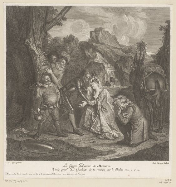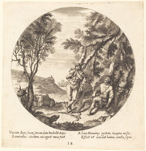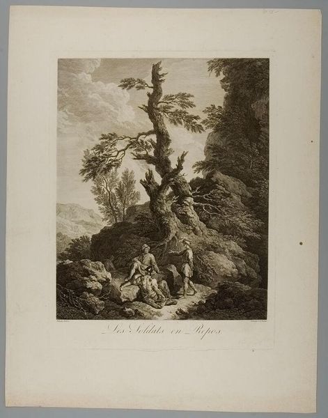 Francesco Bartolozzi made this etching, Drie figuren in een wijngaard, in 1776. It shows a melodramatic scene, likely drawn from popular theater, of an emotional encounter in a vineyard. The print was published in London, as the print line below the image indicates. Bartolozzi was an Italian engraver who spent much of his career in London, where he produced prints after fashionable painters for a growing consumer market. The circular format suggests this print was part of a series, meant to be displayed as decoration in a domestic interior. The vineyard setting and the names "Lauretta" and "Laurette" inscribed below the image point to the influence of French pastoral romance. The vineyard signifies a connection to the land, which at this time was often shorthand for virtue, sincerity, and emotional authenticity. To understand this print better, one could research the popular theater and literature of late 18th-century London, as well as the history of the print market and the decorative arts. The meaning of this image is contingent on its place in the social and institutional context of its time.