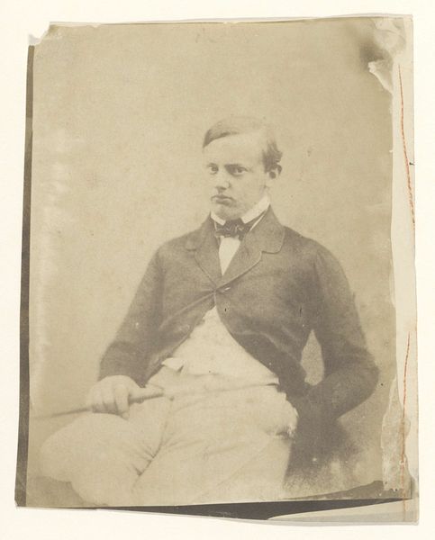 Editor: Here we have David Octavius Hill's "Mr. Brodie, RSA, August 25, 1845, Sculptor, Lived in Cornwell St.," a daguerreotype from 1845. I’m immediately struck by the image's sepia tones and the almost palpable texture, given it's an early photograph. What catches your eye in terms of form and structure? Curator: Primarily, it's the balance of light and shadow that structures this work. Note how Hill employs chiaroscuro to sculpt Brodie's face, directing the viewer's gaze. Also, the subtle gradation from the starkest whites on his collar to the dark, almost undefined background generates an isolating depth. How do you interpret this choice? Editor: I suppose it throws the focus entirely onto Brodie himself, but at the expense of contextualising him, he becomes almost symbolic... Do you think Hill’s decision to depict him seated contributes to the composition's success or detracts from it? Curator: The seated pose brings an element of informality but notice how the carefully arranged clothing adds geometric complexity, drawing attention away from mere realism. The buttons form a neat vertical, acting almost like the fluting of a classical column and further emphasizing the subject's status. This isn't merely capturing an image but also about refining visual ideas through structured forms. Editor: That’s fascinating; I hadn’t noticed the compositional role of his attire! I now see it as more considered than it seemed initially. Curator: Precisely. What appeared merely representational is infused with form, revealing a calculated manipulation of shapes. In essence, this work demonstrates how Hill's choices regarding tone, shape and texture elevate the portrait beyond simple reproduction, creating a new reading of visual portraiture itself. Editor: Thank you. That perspective has broadened my understanding of photographic portraiture. Curator: Mine, too. I'll need to spend a lot more time looking into shape!