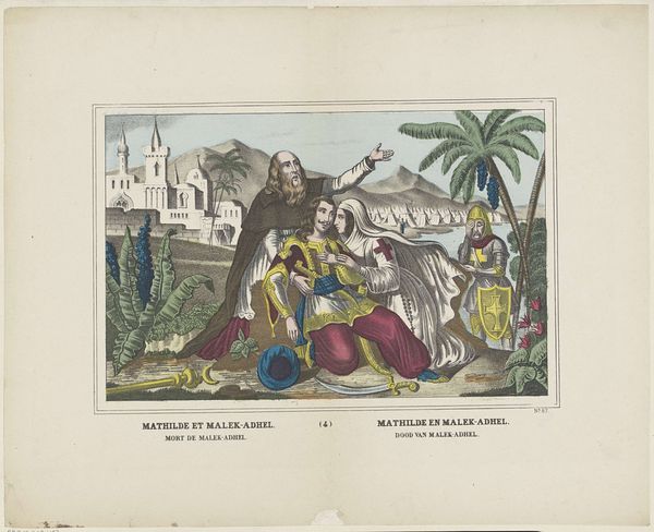 This color woodcut by Aron fra Kangeq, made around 1859, depicts "The Shooting Match on the Occasion of Frederik VII's Birthday". The composition is divided into distinct zones: the foreground filled with figures, a midground with architectural elements, and a background landscape featuring a gently sloping hill. The limited palette focuses attention on the contrast between the sandy yellows and muted greens of the landscape, and the reds, whites and blacks of the figures' clothing. The overall effect is one of compression, as the scene unfolds within a shallow space that lacks traditional depth cues. The arrangement encourages us to consider the relationship between the individual and the collective. Each figure is rendered with careful attention to detail, yet they form part of a larger group. This tension between particularity and uniformity challenges the viewer to question conventional notions of representation. Ultimately, the print's formal qualities invites us to reflect on the complexities of cultural identity and representation in Greenland in the mid-19th century.