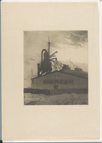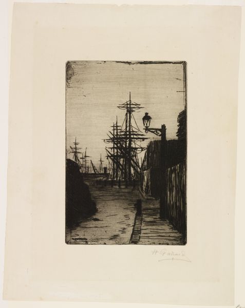 Curator: Willem Witsen's etching, "View of the Molenpoort in Wijk bij Duurstede," dating from around 1908, is a compelling cityscape, currently held in the Rijksmuseum collection. Editor: It evokes a sense of quiet solitude; the monochromatic tones and strong verticals create a rather solemn atmosphere, like stepping back in time. Curator: Absolutely. Witsen’s expertise is evident in his rendering of textures and light. Notice how the rough stonework of the gate contrasts with the smooth surface of the pathway, reflecting a nuanced engagement with materials available and his mastery of the etching process. This print captures a sense of place through subtle variations in tone achieved by careful manipulation of the plate. Editor: It’s intriguing to consider the Molenpoort itself as a symbol here, bridging past and present. Witsen created this piece at a moment of growing industrialisation; capturing such a traditional scene might imply a deliberate connection to Dutch heritage as an anchor during rapid social change. Who passed through this gate and where might they be going? Curator: The social dynamics embedded within are fascinating, precisely. Was Witsen critiquing modernisation? Celebrating pre-industrial modes of production and labour? How might its accessibility factor into wider socio-political contexts? These themes subtly manifest through his handling of perspective and composition; the emphasis on craft contrasts with mass production aesthetics. Editor: Agreed, Witsen consciously directs our gaze to specific figures, seemingly marginal, hinting at class structures and gender roles inherent within that society. Their placement and scale contribute to a quiet narrative about human agency amidst urban structures. Curator: Precisely. This artwork encapsulates themes related to landscape, craft, and industry—inviting us to reconsider both the visible world and its underlying support systems. Editor: Well, considering its focus on architectural elements and social themes, the Molenpoort seems an intersection where history meets personal narratives within an ever-evolving world.