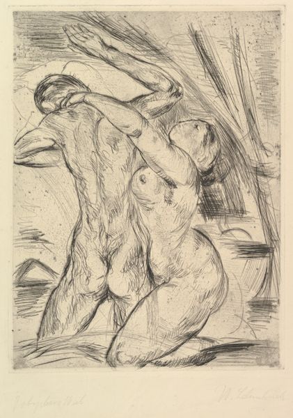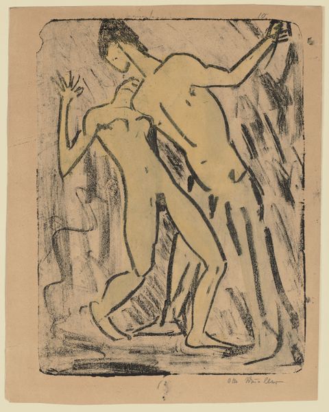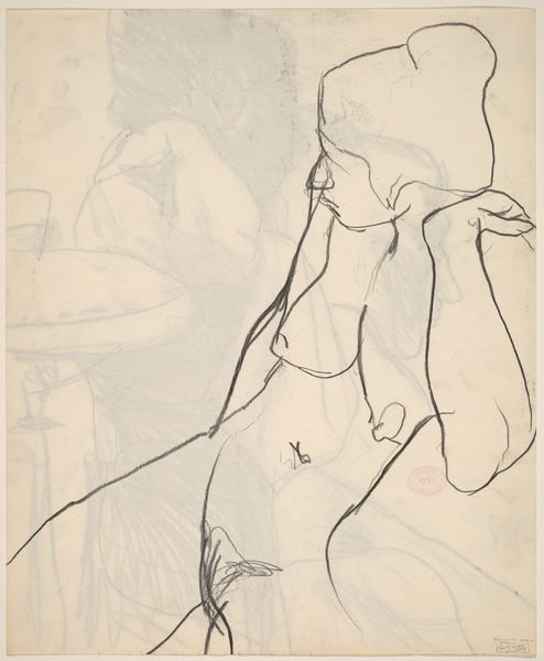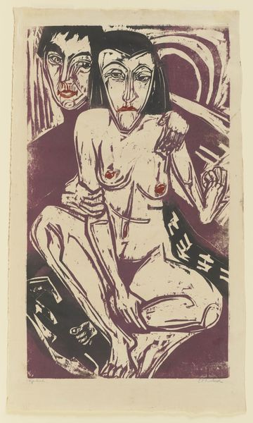 Curator: Ah, "Seated Nude Fixing Her Hair," a raw, intense woodcut created by Ernst Ludwig Kirchner around 1908. It's housed right here in the Städel Museum. What strikes you first about it? Editor: The starkness! It's so stripped back, so…uncomfortable, in a way. All that contrast, like looking at someone through broken glass. Curator: Exactly! Kirchner masterfully employs the medium. See how the black ink defines the negative space around the figure, creating sharp, almost aggressive lines? This isn't a gentle, flowing nude; it’s…angular, fragmented. It rejects traditional academic notions of beauty. Editor: It feels almost brutal, actually. I wonder about her inner world. There is vulnerability in being nude, sure, but there's something else, too. Is this his reflection on his lovers in the moment? Curator: Kirchner was deeply involved with capturing raw emotional states. That angularity reflects the anxiety and alienation felt during this period, particularly within urban spaces, a key tenet of Expressionism. Consider, too, the way her face is obscured. She isn't an individual; she represents a feeling, a state of being. Editor: The lack of individuality certainly amplifies that feeling. The bold, almost violent strokes of the woodcut knife leave very little room for tenderness, though her hands arranging her hair suggest a subtle act of self-care. Or perhaps, self-objectification? Curator: It’s the dance between those elements, the personal and the societal, that makes Kirchner's work so potent. The form serves the thematic whole. The raw quality of the woodcut heightens the raw emotion portrayed. Even the fact it’s a print means this image, this emotion, could be multiplied, disseminated, made ubiquitous. Editor: Thinking about it now, its brutal, yet also weirdly intimate, like a snatched glimpse of raw humanity. So…very him. Curator: Indeed. Kirchner sought to depict experience unfiltered, a mirror reflecting the tumultuous shifts of his time. "Seated Nude" does just that.