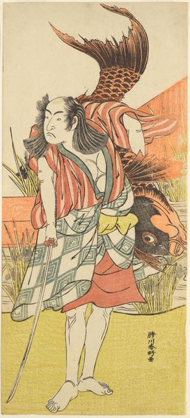 Editor: So, this woodblock print is by Katsukawa Shunko, dating from around 1790. It’s called "Kabuki Actor Ichikawa Monnosuke II as Shinozuka in a Shibaraku Scene." The striking red and intense expression give it a powerful presence. How do you interpret this work? Curator: This print offers a fascinating glimpse into the intersection of theater, gender, and social power in Edo-period Japan. Kabuki was a space where societal norms could be both reinforced and subverted. The “Shibaraku” scene itself is a powerful intervention, where a hero halts injustice. Editor: What do you mean by intervention? Curator: Well, consider the exaggerated makeup and costume: they visually disrupt conventional portrayals of masculinity, challenging established social hierarchies. Also the androgynous nature of Kabuki actors added to the social dialogue. The actor, playing the role of Shinozuka, uses their power to disrupt injustice and right wrongs. Do you see the message of challenging authority, acting as a reminder that injustice could be challenged even within rigid social structures? Editor: That’s interesting; the character, costume and drama really disrupt any common readings. So, Kabuki allowed space to confront real-world injustice. Curator: Exactly! The "Shibaraku" performance, encapsulated in this print, became a form of social commentary. This print immortalizes not just a performance, but also a potent symbol of resistance, wouldn't you agree? Editor: I do. It definitely reframes how I see Ukiyo-e prints; there’s a lot more going on than just pretty pictures. Curator: Precisely! The print makes a dialogue on gender, social expectation, and the possibility of challenging the status quo in a way I never considered.