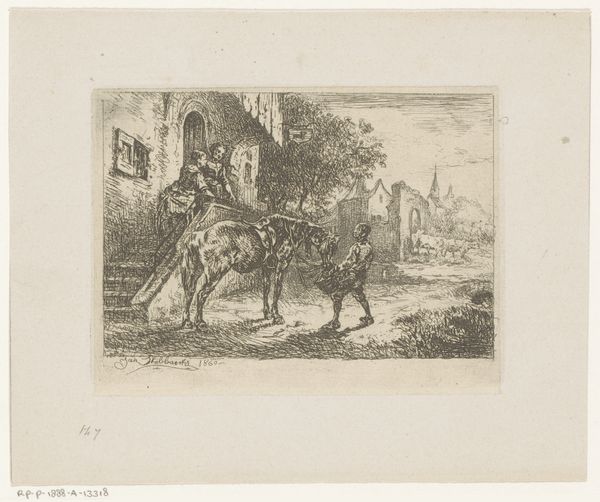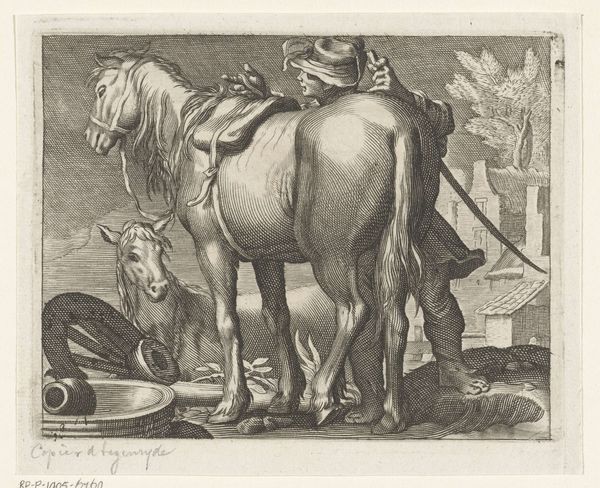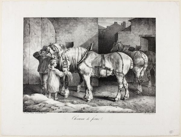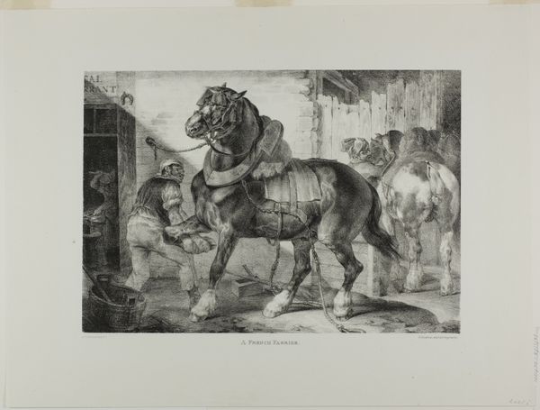 Curator: This lithograph, "A French Farrier," by Théodore Géricault, completed in 1821, gives such a compelling window into the daily life of 19th-century France. Editor: There's a palpable intensity here, isn't there? The air feels thick with dust and sweat, and the horse, powerful as it is, appears so vulnerable under the farrier's attention. Curator: Precisely. Géricault had a knack for capturing raw emotion within these everyday scenes. What draws me in is his careful attention to the light. The stark contrast illuminates the main subject, drawing you right into the heart of the process. You have the horse being worked on by the farrier to the left and background a little right and slightly behind you have others, each with a specific form and coloring to it. Each element stands out while combining well with each other, and allowing us to know that the location of it is where horses get their hooves serviced by farriers. Editor: Yes, and consider the composition. The strong diagonal of the horse’s body directs our gaze from the farrier at work, up to the horse's expressive face. The realism is remarkable, particularly when one considers that he used a lithographic stone, which requires a mastery of shading and a deep understanding of texture to create such depth. The light on the other horses' bottoms provides great depth and draws your eyes to those also! Curator: It's almost as if Géricault isn’t simply documenting the moment. He's suggesting a kind of dignity in labor, celebrating the harmonious dance between human skill and animal strength. Don't you agree? Editor: Definitely. But perhaps also, the underlying theme reflects the tensions within French society at the time—the old ways versus the encroaching industrial world. This type of image makes it clear how it can last in our minds as history progresses. Curator: That's such an astute point! I suppose, that's what makes Géricault so consistently fascinating—he invites us to view, but more importantly, interpret. I feel each of my times through it allows me to view and learn more each time, so well does this artwork age. Editor: It's precisely that kind of layered meaning which rewards continued attention, don't you think? A snapshot in time that ripples through time.