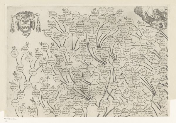 Editor: This is a section of "Tree with Thomas Aquinas," an engraving made around 1590, held at the Rijksmuseum. It depicts an elaborate tree-like structure with lots of circular forms. I'm intrigued by the composition. It seems very ordered, but I can't decipher any clear figures. What do you see in this piece? Curator: Indeed, the work's graphic composition commands our immediate attention. Look at the intricate network of lines; these carefully delineate numerous circles, all interconnected, creating a visually complex yet structured hierarchy. Notice how each circle, containing inscriptions, functions as a node within the larger system. This system points to meaning within the network as a whole. Editor: So, the text in the circles is important? Are you saying that the tree and its structure are symbolic of something beyond its simple aesthetic value? Curator: Precisely. Disregarding any narrative intention of its maker, consider instead the pure formal relationships: the opposition of void and solid, the careful distribution of elements. The artist employs the graphic conventions of engraving to create an intellectual diagram, a visual architecture that echoes, perhaps, scholastic methods of organization. Consider how line weight and spatial relationships contribute to a dynamic tension across the surface. Do you see any specific patterns emerging from this visual architecture? Editor: I'm not sure I could decipher the specifics but you've encouraged me to appreciate it beyond face value and see it as more than just a tree with words! It is thought-provoking. Curator: It is, isn't it? Examining it as a set of formal relationships rather than symbolic representations offers its own rewarding experience. There's a complexity in the forms, which prompts curiosity.