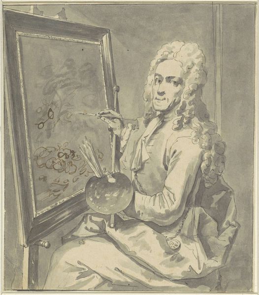 Curator: This drawing, entitled "Portrait of Cavaliere Pompeo Batoni", is attributed to Jean-Baptiste-François Bosio, and its execution can be situated around 1780-1827. It resides here at the Metropolitan Museum of Art. Editor: It's immediately striking—a peculiar sort of levity within its composition. The lines, though carefully rendered, carry a playful, almost caricatured energy. It's confident yet… odd. Curator: Indeed, that confidence is central. The sitter’s flamboyant attire is meticulously transcribed with fine ink lines; examine how Bosio captures the fur trim. His mastery conveys not merely texture, but a status of lavish material excess and Rococo aesthetics. Editor: Absolutely, yet the materiality transcends mere opulence. I'm interested in what he holds. The papers—or prints?—in Batoni’s left hand. The brush… that positioning invites reflection upon production, no? Batoni as both subject and agent within the commercial machine of portraiture. Curator: An astute point. There's a dialectic here: Bosio capturing Batoni, the portraitist of grand tourists. And that canvas behind... It signifies the means, the instruments of creating art, framing the cavity in a manner not totally dissimilar from a stage. It begs the query: What level of reality is transcribed here? Editor: Yes, precisely. I'm drawn to consider how the materials involved reflect the subject. A study of the paper's composition, the origin and the grade of ink used—such examination can clarify relationships between maker, patron, and the burgeoning art market. Curator: I think to interpret further in terms of process, we would gain from understanding its situation within the career of Bosio. As we discern elements within the formal structure of the composition and light in the crosshatching. Editor: True, those marks also tell us the direction of movement for the author to construct his portrait of Cavaliere Pompeo Batoni. Each layer, or addition to his clothing to create his stature adds to the materiality and his stance in society. Curator: Yes, the visual dynamics give substance to all our views.