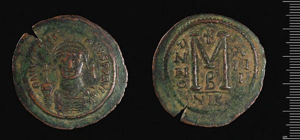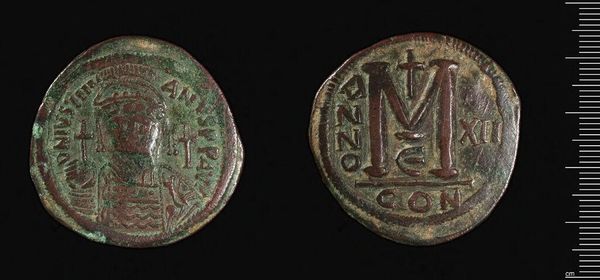 Curator: This is a bronze coin of Justinian I, held in the collections of the Harvard Art Museums. Editor: The image feels heavy, almost weighted down by time. It’s interesting how such a small object carries so much… gravity. Curator: Indeed. Consider the power embedded in this everyday object. The coin isn't simply currency. Editor: Absolutely. The portrait of Justinian, barely visible after centuries, would have conveyed his authority directly to the people. It’s a form of early propaganda. Curator: And on the reverse, the large "M" symbolizes the value of the coin itself, but framed within the iconography of imperial power and divine sanction. Editor: It makes you wonder about the hands this coin has passed through, the exchanges it facilitated. It's a tangible link to a distant past. Curator: A past built on systems of power, belief, and economics, all distilled into this humble little disc. Editor: Ultimately, an object lesson in how we create and perpetuate meaning.