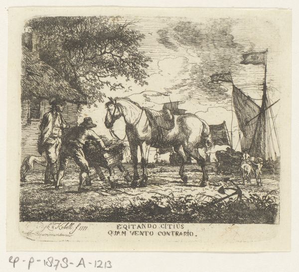 Johann Adam Klein’s etching, "Farmer and His Cart," captures a moment of pastoral calm through intricate line work and tonal variation. The composition is structured around the central mass of the cart, with the figures of the farmer, horse, and cattle arranged to create a scene of respite. Klein masterfully uses the etching technique to create a range of textures, from the dense foliage to the worn surfaces of the cart. The contrast between the light, open sky and the detailed foreground emphasizes the materiality and the labor inherent in rural life. The strategic placement of shadows adds depth, inviting the viewer to contemplate the quiet yet persistent rhythm of agrarian existence. This emphasis on form and structure invites a semiotic reading. The horse and cart, symbols of labor and transport, are rendered with a realism that elevates the ordinary. The artwork functions as a statement on the value of rural life.