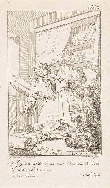 Editor: This is "Radeloze geschiedschrijver" – "The Helpless Historian" – a pen and ink drawing by Pieter van Woensel, made around 1796. The frenetic lines give it a slightly manic feeling. What stands out to you in its composition? Curator: The drawing’s power resides in its stark arrangement of symbolic elements. Note the books labeled "Waarheid" and "Opinie"—Truth and Opinion—flanking the central figure. The billowing smoke and the Latin inscription above, "Ne Jupiter quidem omnibus," which translates to "Not even Jupiter pleases everyone", further enrich the narrative. Consider the texture of the lines, how they create a sense of unease despite the balanced symmetry. The composition itself argues that finding truth amidst popular opinion is a struggle. Editor: It's interesting you focus on the arrangement of elements and how the textures contribute to a feeling of unease. Do you see this drawing as a comment on the role of historians? Curator: Precisely. The historian, caught between Truth and Opinion, is overwhelmed, indicated by the smoke and gesture. This state highlights the complexities inherent in historical interpretation. Consider how Woensel uses the contrast between the sharply defined books and the looser rendering of the historian. The structure provides a key to the drawing’s semiotic density. The figure’s pose further amplifies the historian's mental and artistic struggle with his intellectual burdens, even as it invites further interpretation. Editor: So you're seeing a deliberate structure and symbolism conveying a distinct argument. That’s a fascinating perspective! Curator: Indeed. Considering the elements of line, form and composition reveals the deeper layers of meaning embedded within what appears a simple drawing. It emphasizes the perpetual tension between objective fact and subjective interpretation. Editor: Thanks for unpacking that for me. It’s amazing to see how much meaning can be gleaned just by looking at the structure and the visual choices the artist made.