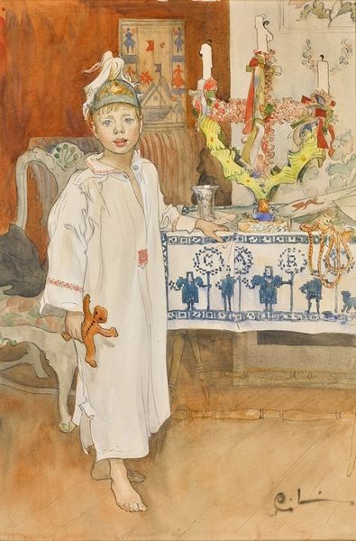 Carl Larsson, a prominent figure in the Arts and Crafts movement, created this watercolor titled "Around the Evening Lamp" in 1900. Larsson was known for his idyllic portrayals of family life, reflecting the values of domesticity and simplicity that were gaining traction during a time of rapid industrialization. Here we see what it meant to be a middle-class family in Sweden at the turn of the century. Gender roles were still largely traditional, with women often depicted as caregivers, but there was growing support for women's rights and suffrage. Larsson's wife, Karin, was a textile artist and designer and he often portrayed her as an equal partner in their domestic sphere. The image resonates with warmth and a sense of belonging, inviting us to consider the emotional bonds that tie families together. However, it also prompts us to reflect on the societal norms and expectations that shape our understanding of family, gender, and identity, both then and now.