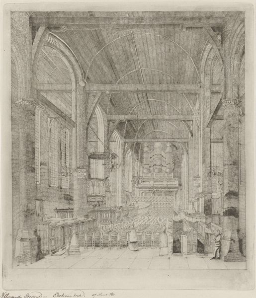 Curator: This print, dating roughly from 1846 to 1913, is called "Kerkinterieur" which translates to Church Interior. It’s attributed to Reinier Evert Johannes Roeterink, and we believe it's an etching or engraving, possibly with ink. Editor: Wow, my first impression is that it feels quiet. Eerily so. It's like the sound just got sucked out of this old church. Very gothic. The cross-hatching gives it an unsettling texture. Curator: The technique certainly speaks to its time, a period grappling with rapid industrialization and secularization. Notice the perspective, how the artist guides your eye toward the vanishing point just behind the figure near the door. Churches at this time were losing significance and this piece may reflect anxiety toward such loss. Editor: True, the figure does seem small and alone in such a grand space. But, beyond the history, I feel like this is a piece about shadows. About secrets whispering within those stone walls. What stories does the building hold? Curator: Exactly. Church interiors became a popular genre precisely because of these shifting social and religious attitudes. They offered a nostalgic glimpse into a past of reverence, a pictorial tradition that gained considerable momentum from Romanticism. Think about the role of art and the cultural function the piece served, reminding people what life once was. Editor: And there’s a timeless quality too. Like it could be anywhere. The light filters in creating patterns. You want to imagine organ music or a solitary prayer— the image prompts introspection and the enduring human connection to something bigger than themselves. You want to almost write into existence all those moments within this church, whether happy or solemn. Curator: Right. By depicting a church interior in this style, Roeterink is also participating in constructing our understanding of this moment, highlighting particular feelings while minimizing the impact of social reform. In an institution facing increasing public debate and controversy, that makes this print particularly charged. Editor: Maybe, but for me, it goes beyond all that! There's mystery, and a profound invitation for stillness. Ultimately, an artist asks the viewer to just...be there. Roeterink has done something beautiful with such simple means. Curator: I suppose that's the lasting power of art, to resonate personally despite the tides of time and sociopolitical changes. Editor: Exactly. Which is pretty good for something made of ink, wouldn’t you agree?