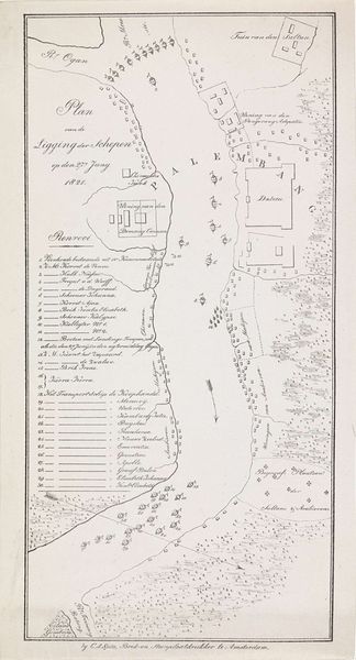 Curator: Before us we have a fascinating piece from 1821, "Kaart van de rivier bij Palembang," or "Map of the River near Palembang." It’s currently held in the Rijksmuseum, crafted anonymously using drawing, etching, and ink on paper. Editor: My initial impression is how strategic it feels. The line work is meticulous, precise, yet simultaneously the washed-out color palette evokes a feeling of impermanence, of colonial ambition perhaps not entirely rooted. Curator: It's intriguing to consider the purpose behind such a detailed rendering. Beyond a simple depiction of a river, this map serves as a crucial artifact revealing the intersection of cartography, commerce, and colonization in the early 19th century. Look at the precision in detailing the river’s edges. Editor: Absolutely. And you can tell it was printed because there is a printer listed, but what I find interesting are these notations and symbols: fortified positions, anchoring points, types of ships… It highlights the power dynamics at play and it also speaks to the kind of work produced through collaborative labor between the draughtsman, the engraver, and the printer. Curator: The absence of a named artist directs us to the larger structure that supported its making: presumably a military or mercantile operation. I find the level of detail suggestive, possibly as preparation for military deployment or control over vital trade routes. This was a landscape primed for extraction. Editor: Yes, these kinds of visualizations were instrumental to establishing control over the materials, resources, and labor available across this terrain. Thinking about how this object circulated at the time, who had access to it, it makes you consider questions of colonial governance and geopolitical tensions that must have impacted the daily existence of people living there. Curator: By focusing on these details, we can decode the social and political narrative interwoven into the paper and ink. Its materials reveal a world in motion and transformation, illustrating Palembang as a key site of cultural and material exchange. Editor: It shifts our gaze from a simple landscape drawing to something that is charged, implicated, and loaded with its original, intended use. Curator: Exactly. Reflecting on its creation and role, the map invites us to consider the profound impact of geographic representation on our understanding of the world. Editor: For sure, and considering all of the hands that contributed to this “map” makes you realize it can be considered the product of many authors, not only its elusive creator.