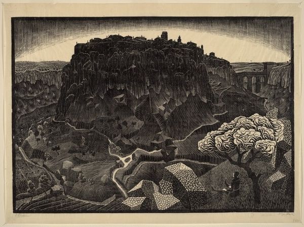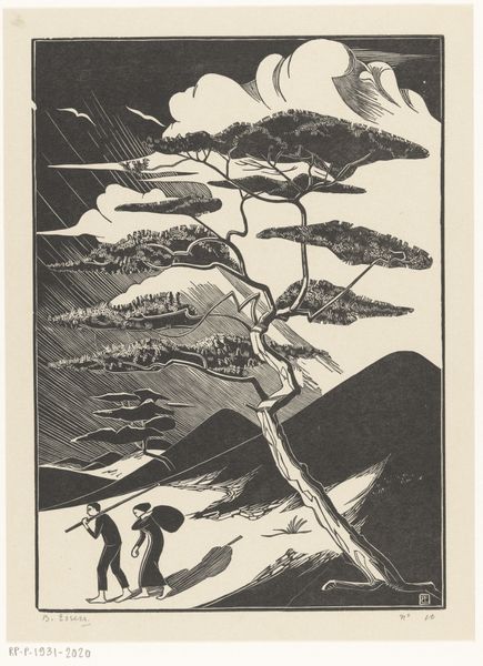 Curator: This woodcut print, "Mt. Katahdin - from Ripogenos Gorge," was created in 1965 by Carroll Thayer Berry. What are your immediate impressions? Editor: Stark! The interplay of solid black and reserved white carves out a dramatic space. It evokes a sense of deep solitude, almost forbidding, but majestic. Curator: Absolutely. Berry harnesses the graphic power of woodcut to communicate the grandeur of Katahdin. The mountain itself, a symbolic representation of untouched wilderness, is placed at the very top. Editor: Yes, and the visual language here is key. Notice how the lone birch in the foreground acts almost as a symbolic mediator. Its slender form against the monumental mountain reminds me of Romantic-era works that use the “Rückenfigur” to prompt contemplation of nature's sublimity. Curator: Interesting, you bring up the notion of the sublime! Berry expertly controls value contrasts. Dark, brooding tones in the gorge and the stark white of the snowy mountain create a potent emotional pull. It isn’t simply a record; it's an active construction of visual interest. Editor: Definitely. The gorge could symbolize the dangerous or unconscious elements of the mind—the untamed raw power. While the summit perhaps, embodies aspiration or enlightenment? Katahdin, and the surrounding Maine wilderness more broadly, became an important image for environmental movements. Curator: Indeed. The work reveals a refined sense of compositional architecture. Note the converging lines, drawing the eye into the composition—a deliberate attempt to engage the viewer. The contrast is essential for understanding this piece; this creates an interplay between the solid permanence of Katahdin and its temporality reflected through fleeting images in the water and the foreground details of exposed rocky riverbeds. Editor: Well observed! It speaks volumes about our ingrained associations between landscapes and meaning, doesn't it? We keep searching for echoes and messages. Curator: It’s clear Berry had much to say here through carefully articulated visual relationships and tonal gradations. Editor: Agreed. It makes me want to revisit some historical accounts of the early Katahdin expeditions and think further on wilderness in the American psyche!