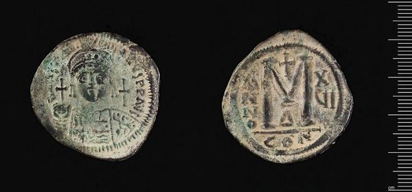 Curator: Here we have a coin of Justinian I, weighing in at 23.47 grams. It whispers tales of an era where empires rose and fell, and I find myself wondering about the hands it passed through. Editor: It’s incredibly weathered—almost ghostly. The figure on one side, presumably Justinian himself, seems to stare right through you with an air of imperial authority but looks worn, almost humbled, by time. What do you make of its symbolism? Curator: The symbols are pretty straightforward: power, faith, and the Byzantine state. But I think the real poetry is in the wear and tear, it's a testament to its journey. Editor: Absolutely, this isn’t just an economic object; it's a historical document, carrying centuries of social and political weight. It speaks to how societies construct power, and what it means to legitimize rule through representation and circulation. Curator: And maybe, just maybe, a reminder that even the grandest empires eventually fade, leaving behind only whispers on a worn-out coin. Editor: A poignant thought, indeed. It serves as a material reminder of how power and history are always mediated through objects and representation.