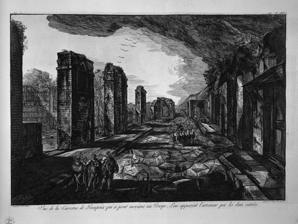 Editor: This etching is titled "Diet or place of entrance to several great cubicles and other magnificent rooms, existing in the Villa Adriana," by Giovanni Battista Piranesi. It seems to capture a ruin overtaken by nature. It has this overwhelming feeling of history. What story does this image tell you? Curator: Well, Piranesi was very interested in depicting Roman grandeur, but always with a critical lens. He presents us with the glory of the past, but intertwined with its inevitable decay and transformation. Look how nature reclaims the architectural spaces. Editor: So, you are suggesting it is about time? What was the social environment like at the time he produced this print? Curator: Absolutely. It's crucial to remember Piranesi was working in a period of burgeoning Neoclassicism, a movement fueled by the rediscovery of ancient sites. This fueled a fascination with, and idealization of, the classical world. His prints, widely circulated, profoundly impacted the period’s visual culture, shaping how people perceived ancient Rome. However, he doesn't give us clean, pristine reconstructions. Editor: So it's about memory and reconstruction? The role of institutions in shaping our vision of the past, so to speak? Curator: Precisely. Consider the market for these images. Who was buying them? And what did these depictions of grand ruins represent to them? It suggests both the enduring legacy and the ultimate fate of empires. Did the work inspire or remind them of morality? Editor: Fascinating! I see it now: It's less a celebration of Rome, more of an elegy, and a reflection on how we perceive power through its physical remnants. Thank you. Curator: It seems a fine topic of discussion for any period. A good moment spent thinking about that indeed.