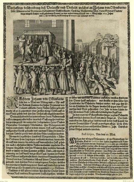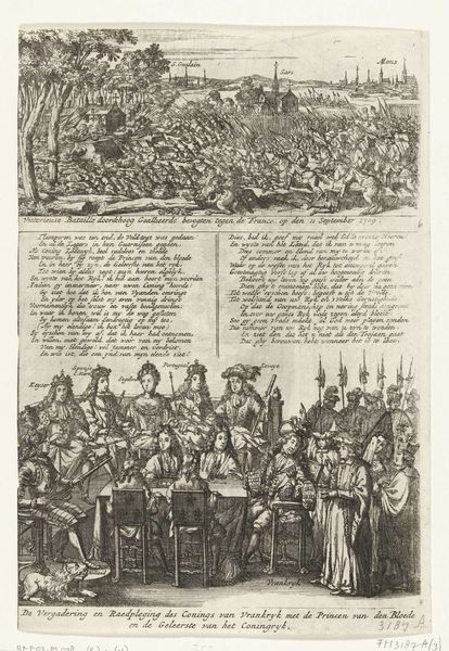 This print, made by an anonymous artist, depicts the departure of the French army from Utrecht in 1673. The monochromatic etching is divided into two distinct visual fields: the upper section contains the image itself, filled with figures and architectural details, whilst the lower section is filled with dense text. The texture is detailed yet uniform, creating a stark contrast with the chaotic scene it portrays. Focusing on the upper image, the composition is divided into foreground, middle ground, and background, each densely populated. The foreground is dominated by the departing troops, their figures rendered with varied strokes to suggest movement and disarray. In the middle ground, the skyline of Utrecht is etched with precise lines, offering a stark contrast to the fleeing army. The use of linear perspective draws the viewer's eye towards the distant horizon, but this is complicated by the static, almost monumental, quality of the architecture. The print's structure, with its juxtaposition of text and image, challenges a singular interpretation. It represents an effort to document and editorialize a specific historical moment, complicating traditional notions of historical representation.