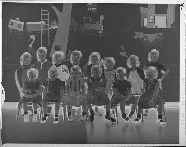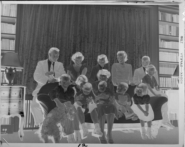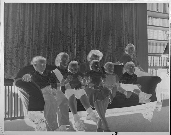 Editor: This photograph, "Untitled (woman with several children on couch)" by Lucian and Mary Brown, captures a fascinating family portrait, yet the inverted tones lend it a rather unsettling mood. What strikes you about it? Curator: It's definitely eerie, isn't it? But it's also strangely intimate. The negative space almost pushes us into the scene, like a forgotten memory surfacing. The woman seems weary, but there's a fierce protectiveness in her stance. It’s as if the artists caught a glimpse of the silent dramas playing out behind closed doors. Editor: That's a beautiful way to put it. I hadn't considered the idea of protectiveness. Curator: Exactly! Makes you wonder about the untold stories within this family, doesn't it?