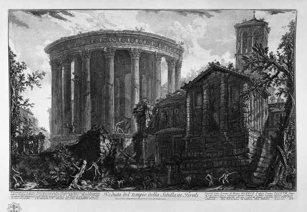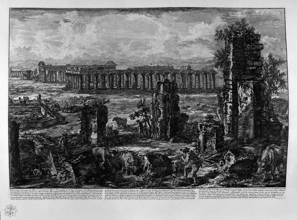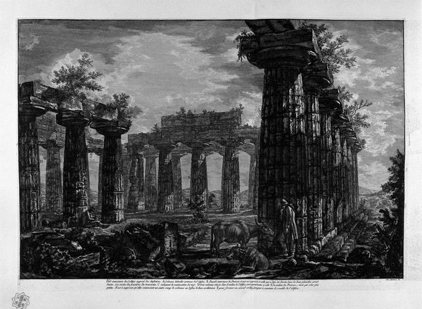 Editor: Here we have Giovanni Battista Piranesi's "View of some columns of the facade opposite to that of the preceding table", a print made using etching. It gives off such a somber, almost desolate feeling despite its detail. How do you interpret this work? Curator: As a materialist, I see in this print a meditation on the labor embedded within ruins. Look at the sheer volume of material depicted – stone, primarily. What kind of quarrying, transportation, and construction went into creating this structure? Now observe its state of decay; notice the etching lines emphasizing its fragmented nature, reflecting the historical processes that dismantled this monument. Editor: That’s a fascinating way to look at it. I was focusing more on the aesthetic impact, the way the light and shadow play off the columns. Curator: And that aesthetic impact is inseparable from the labor. Piranesi meticulously reproduced the textures of the stone, the signs of wear and tear. It highlights not only the ambition of the original builders but also the forces of nature and history, as agents of change reshaping human endeavors. The people within the etching emphasize a dialogue between past labour, ruins, and the present moment. What do you make of this dialog? Editor: It's an interesting contrast. Their presence emphasizes that we are experiencing a snapshot in the continual cycle of creation and destruction. I had not thought so deeply about this connection! Curator: Precisely. This piece invites us to contemplate not just the aesthetic beauty of the past but also the processes of labor, materiality, and ultimately, the inevitable forces that impact human structures.