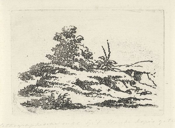 Curator: Before us is "Untitled (Hill with Shrubs)" by Nandalal Bose. This artwork currently resides in the Harvard Art Museums. Editor: It's remarkably spare, almost austere. The stark contrasts of the monochrome wash create a rather melancholic atmosphere, don't you think? Curator: Bose, deeply influenced by Tagore and the Bengal School, sought to redefine Indian art against colonial academic styles. He wanted to return to indigenous forms. Editor: You can see that in the brushwork, can't you? The swift, calligraphic strokes give the landscape an ethereal, almost dreamlike quality. It's less about representation and more about capturing the essence. Curator: Precisely. Bose played a key role in visualizing Gandhi's vision of an independent India, promoting swadeshi ideals through his art. Editor: So this landscape, however simple, becomes a symbol of national identity and cultural revival. A very potent use of minimalist form. Curator: Yes, a potent image indeed. Bose invites us to contemplate the nation through the quiet beauty of its landscapes. Editor: And perhaps find solace in its stark beauty.