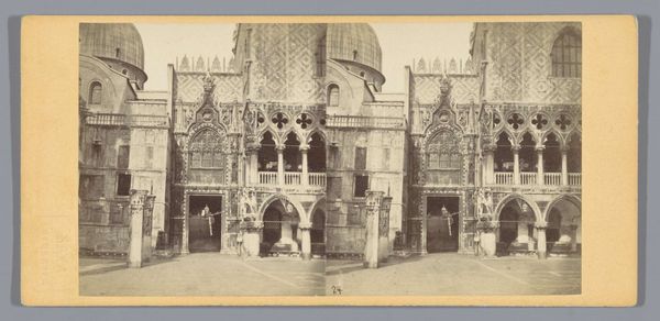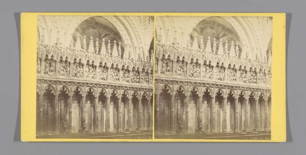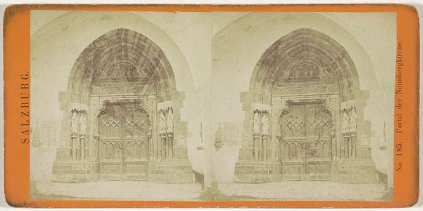 Curator: Well, if that isn't a marvel in monochrome! This is a collotype print from somewhere between 1860 and 1880 by František Fridrich, showing the South Portal of the Cologne Cathedral. A classic cityscape, wouldn’t you say? Editor: Monumental is the word that leaps to mind. The sheer verticality—it makes you feel utterly minuscule. There’s a certain drama in the almost-sepia tones; a real sense of history, like looking back through a well-loved photograph album. Curator: Absolutely. Fridrich’s choice of collotype lends a soft, almost painterly quality to the print, which is interesting when considering how precisely architectural photography usually aims to document structures. He’s capturing light and texture as much as stone. The repetition and symmetry of the portal… typical neo-classicism in many regards. Editor: Yes, but observe how the photographic medium renders the intricate carvings—almost dizzying detail, line after line receding. Also consider the building material—I suspect we are seeing local trachyte stone and basalt lava stone being implemented here. Do you think the flatness of the print emphasizes that flatness we see across the façade? Curator: Precisely, it’s flattened space adding emphasis to the facade’s ornament. What’s curious is how alive the cathedral seems, despite being inanimate stone. Almost like an organism. What a thought— a breathing building made from rock! Editor: Or perhaps consider this a frozen performance. The image allows us a glimpse back to its creation—light, exposure, printing all combined and here for us, static in a time we will never visit physically. I do get the sense of arrested action. Curator: So well put! Considering that Fridrich might’ve conceived it, and with your interpretation, now I get an inkling of movement in it all! Editor: Ultimately, for me, it evokes that strange paradox: how something so solid and enduring, is still captured as but a fragile and fleeting memory. Thank you, for illuminating that it is breathing too. Curator: Likewise—and with such intricate breath.