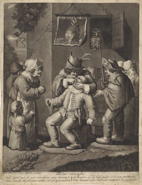 In this drawing from 1795, Johan Daniël de Gijselaar captures a tense moment using pen and brush in grey ink. The composition, built on contrasts of light and shadow, draws us into the disquiet of a Dutch family confronted by French soldiers. Notice how de Gijselaar uses a stark tonal range to highlight the disruption. The soldiers, rendered with precise lines, stand at the doorway—a threshold between outside intrusion and domestic vulnerability. Inside, the family's reactions range from the mother's assertive stance to the father's almost comical despair. This contrast underscores a society wrestling with occupation, where traditional order is upended. The artist doesn't just depict a historical event; he dissects the psychological impact through carefully orchestrated visual cues. The varying reactions serve as a microcosm of societal discord, challenging viewers to consider the complexities of power and resistance in times of upheaval. The strength of the artwork lies in how de Gijselaar uses the formal elements to capture the nuanced experience of a nation under pressure, demonstrating that art serves as an ongoing record of collective memory.