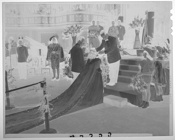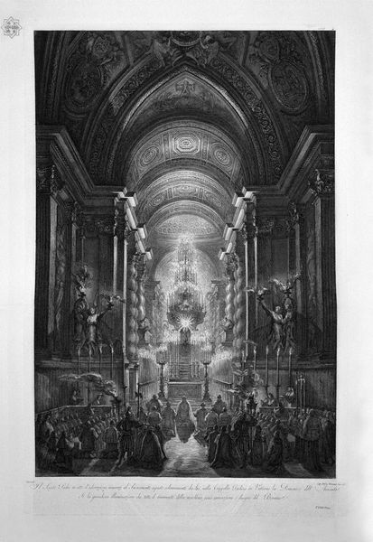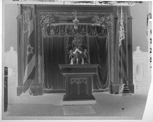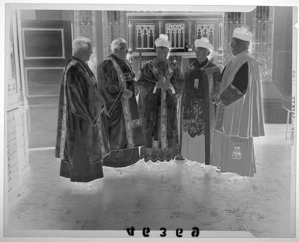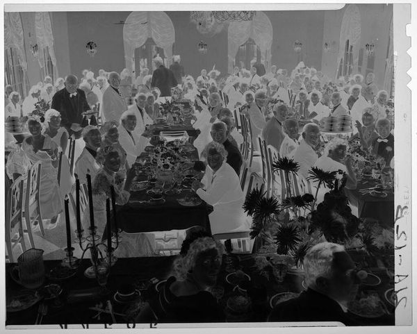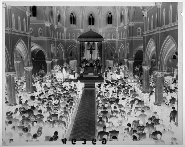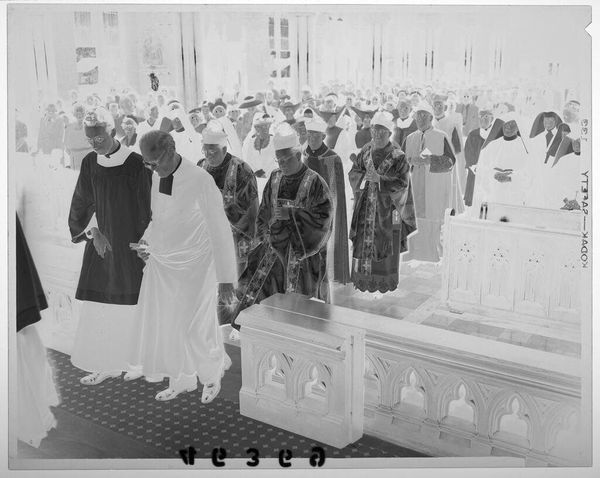 Editor: This photograph by Jack Gould, "Untitled (arrival of archbishop in St. Louis cathedral)," shows a high-angle view of a religious ceremony. The high angle makes the subjects seem small, and the light and shadows give it a somber feel. What can you tell me about this work? Curator: This image offers a glimpse into the power structures within religious institutions. Consider the composition: the Archbishop's arrival is staged, almost theatrical, with a clear hierarchy established through spatial arrangement. How might this reflect broader societal inequalities of the time? Editor: That's interesting. I hadn't thought about it in terms of power dynamics. Curator: The photograph can be read as a document of social practice, revealing the ways in which authority is visually constructed and reinforced. Thinking about this, what does the image tell us about the artist's perspective on these religious rituals? Editor: It feels like the artist is observing rather than participating, almost like a critical outsider. Curator: Precisely. It encourages us to question the narratives of authority and to reflect on the complex relationship between religion, power, and representation. Thanks for making these important observations!