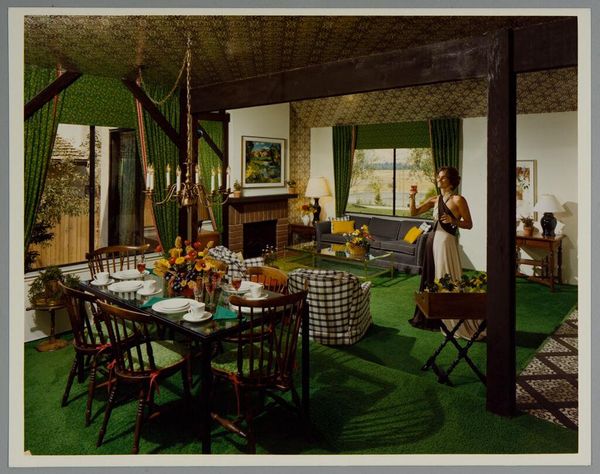 Editor: Here we have "Untitled (interior with orange carpeting)" by Del Carlo Studio from the Harvard Art Museums. The bright orange carpet and matching furniture make me wonder about the social context of the time it was made. What do you see in this piece? Curator: Well, this image is fascinating from a historical perspective. The interior design speaks volumes about the aspirations and cultural values of the time, doesn't it? Consider how the emphasis on domesticity reflects the roles of women and families. Editor: I see that, especially with the woman reading in what looks like a staged scene. How do institutions like museums shape our understanding of images like these? Curator: Museums can frame these images as historical documents, influencing how the public interprets the past and the cultural forces at play. This image can be a lens through which we view societal norms and ideals. Editor: That makes a lot of sense. It's interesting to think about how an image like this is both a record and a construction of a certain lifestyle. Curator: Precisely! Thinking about how it's displayed and discussed really opens up questions about the politics of imagery, doesn't it?