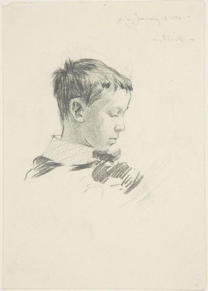 Curator: Let's discuss Denman Waldo Ross's "Kivu Girl," a pencil sketch he made during his travels. What strikes you about this piece? Editor: Well, the sketch itself feels very immediate, almost like a quick study. It’s interesting that he titled it "Kivu Girl", placing her geographically. What can we infer from this title and the context of his travels? Curator: Ross's travels and artistic choices occurred during a period of intense colonial interest in Africa. The title highlights the subject’s origin, framing her within that colonial gaze. Does the sketch, with its emphasis on physiognomy, reflect any contemporary views about race and identity? Editor: That's a critical perspective. I hadn't considered the potential implications of how he chose to portray and name her. It makes me wonder about the power dynamics at play. Curator: Exactly. By understanding the socio-political climate in which Ross created this work, we can start to unpack the complexities of its meaning and reception. Editor: This has really changed my perception. I will make sure the audio guide includes this interpretation. Thanks.