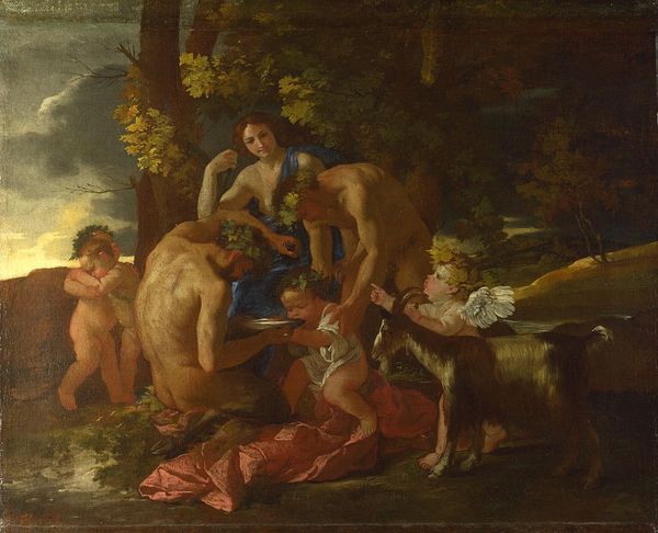 Editor: So, this is "Putti Playing" by Hendrik van Limborch, made sometime between 1700 and 1720, using oil paint. It's quite a scene! There are all these nude children… or putti, I guess, playing. There’s a real sense of freedom and abundance. What do you see in this piece? Curator: The scene absolutely radiates a particular kind of elite, Baroque indulgence, doesn't it? Consider the socio-political context of the early 18th century. Images like these were often commissioned by the wealthy ruling classes, and we must look at them with critical awareness. Editor: How so? Curator: Well, look at the sheer excess—these chubby, naked bodies, the lush landscape. Doesn't this present a very specific idea about pleasure and privilege, particularly within a society that was likely grappling with disparities and hierarchies? Editor: I see what you mean. It’s not just innocent fun. The painting also speaks to a certain social fantasy of leisure, or perhaps even absolution. Curator: Precisely. We need to be aware of the image-making and art practices reinforcing existing social and political structures. Does the light, airy treatment obscure darker, less visible aspects of the ruling class's dominance? Who does such representation serve, and what it obscures or oppresses? Editor: It gives me a lot to think about, it really complicates the way I initially perceived the painting, to explore that more critically. Curator: Hopefully, it also gives you a new vocabulary for discussing such imagery. Remember, engaging with art is also engaging with its complex social fingerprints.