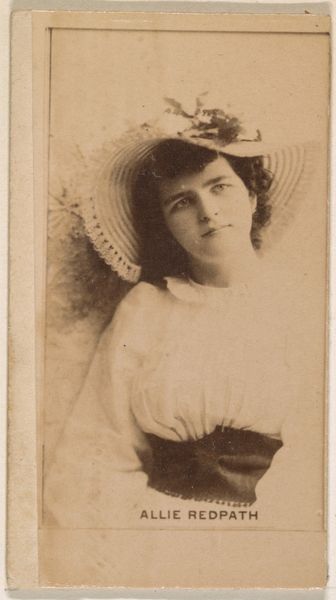 Curator: My first impression is...faded glamour. There’s a delicacy, almost a spectral quality. Editor: Let's contextualize that impression. What you're seeing is part of a series of portrait cards of actresses, called “From the Actors and Actresses series (N45, Type 5) for Virginia Brights Cigarettes.” It was created between 1885 and 1891 by Allen & Ginter. Curator: Actresses as collectibles – it's funny to imagine chasing them down like baseball cards! What was the relationship between stardom and commercialism like then, I wonder? Editor: These trade cards were very much a part of building celebrity culture. Allen & Ginter distributed these portraits in cigarette packs. Consider how the consumption of tobacco, traditionally associated with masculinity, is intertwined with images of idealized femininity and how these types of marketing techniques reinforced prevailing gender roles. Curator: That contrast hits sharply when looking at it, the fragility of the image paired with the brash marketing tactic of cigarette ads. This contrast sort of emphasizes how women’s beauty was a commodity at this moment in history. Editor: Exactly. The photographic medium here is worth noting as well, photography at this time, while gaining ground, was also often manipulated to present idealized versions of sitters in very staged and artificial settings. What could this mean for our understanding of identity today? Curator: It does makes you question how we interpret celebrity and fame today! There’s also this haunting sense of temporality in the photographic process… how can we view such ephemeral material today with an informed gaze? Editor: A really pertinent point and this image can give space for a more comprehensive dialogue concerning how society at large participates in these economies of seeing. This card is presently located in the collection of the Metropolitan Museum of Art. It serves as a fascinating glimpse into both advertising strategies and representational norms. Curator: Makes you realize the layers of intention and cultural context embedded within even the most unassuming little objects, doesn't it? A simple portrait becomes a portal to understanding complex dynamics. Editor: It truly does! I am struck by how relevant this little cigarette card continues to be even after well over a century since its distribution.