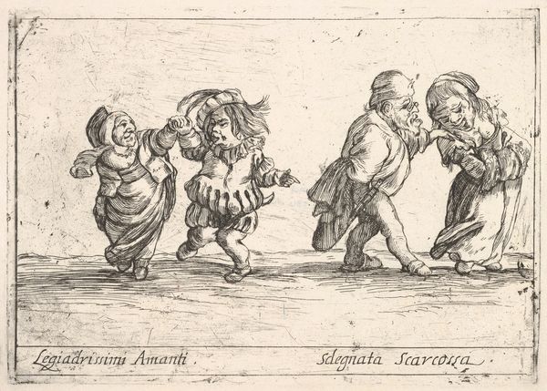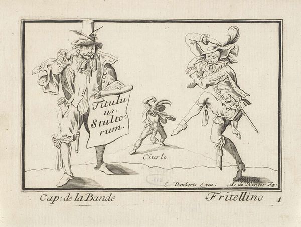 Anthonie de Winter made this print, titled "Mestolino, Cap. Grillo en Guastetto," using etching. The way the image is produced significantly influences its appearance. The incised lines create a sense of depth and form, using hatching and cross-hatching to suggest shading and volume. The etching technique involves coating a metal plate with a waxy, acid-resistant substance, then drawing through this coating to expose the metal. Acid is then applied, biting into the exposed lines. The plate is then inked, and the ink wiped from the surface, remaining only in the etched lines. Finally, the plate is pressed onto paper, transferring the image. This process, and its reliance on skilled labor, can be tied to wider social issues of labor and class, as the production of prints like this was often a collaborative effort involving artisans and workshops. Considering materials, making, and context is vital to understanding the full meaning of an artwork like this, challenging traditional distinctions between fine art and craft.